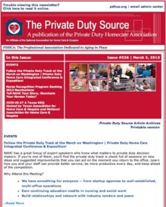 he purpose of the Private Duty Source is to provide a focused review of legislative and regulatory actions that are of concern to the private duty industry. Is is a publication of the Private Duty Home Care Association. The Private Duty Source also is intended to serve as a resource for the private duty industry.